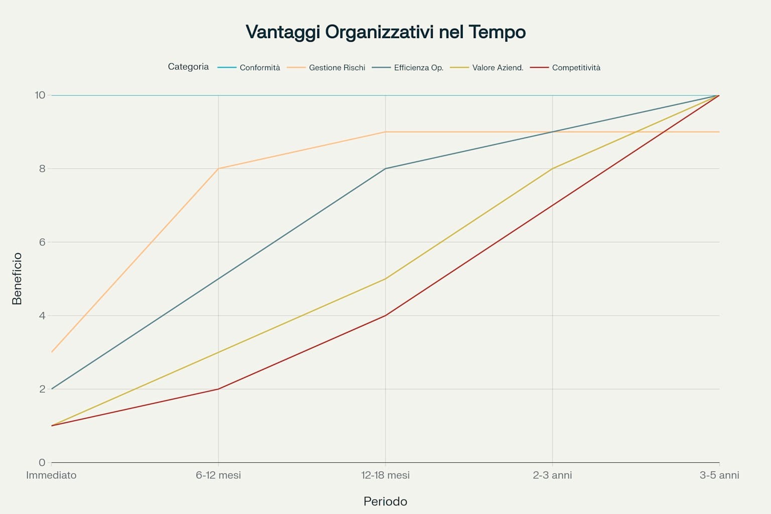 L’implementazione di adeguati assetti organizzativi genera un ampio spettro di vantaggi per le imprese, che si manifestano con tempistiche differenziate e impatti crescenti nel tempo. L’analisi dell’evoluzione di questi benefici dimostra come l’investimento iniziale in sistemi di governance si traduca in ritorni economici e strategici significativi.